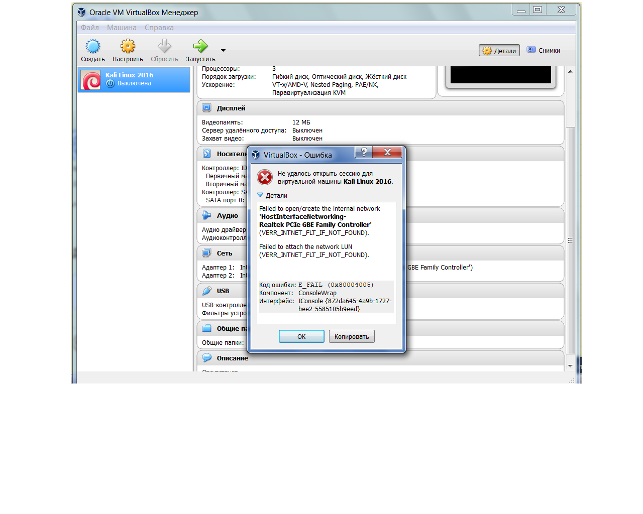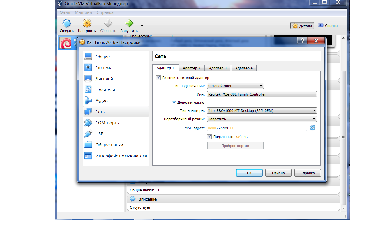 VirtualBox не хочет запускать Kali Linux, при установке сетевого адаптера в режим сетевой мост. Помогите, очень надо запустить именно с этим режимом