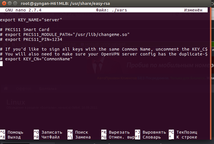 Всем привет, подскажите пожалуйста умные люди как сохранять значения в утилите Easy-RSA?? Запуская я ее cd /usr/share/easy-rsa nano ./vars правлю то что мне нужно, и все не чего не могу сделать кроме как закрыть и тогда не что не сохраниться( помогите разорбраться.