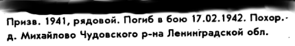 Да... темка. Может кто то есть здесь из Новгородской области? Есть только выдержка из книги памяти В Гугле вообще не могу найти записей по деревне Михайлово, Чудовского района. Наткнулся только на вот такой рассказ. Очень похоже по описаниям на ту же местность. http://st-vestnik.ru/vazhnaya-tema/...zaxoroneniya-politruka-stepana-bespalova.html По идее это сейчас называется мемориалом Любино Поле. Но на фотках из этого мемориала фамилии не нашел. http://nezabudem.net/obelisks/764 Может не все сфоткано? В общем такая вот история. Если кто знает по поводу боев в той местности - буду благодарен за инфу. Давно хочу поехать поискать захоронение своего деда. Сейчас конечно с нынешними отношениями между Россией и Украиной это все вообще будет проблематично. Но пофиг. Обязательно найду время на то чтоб побывать на могиле своего деда и почтить его память там где он нашел свой покой.