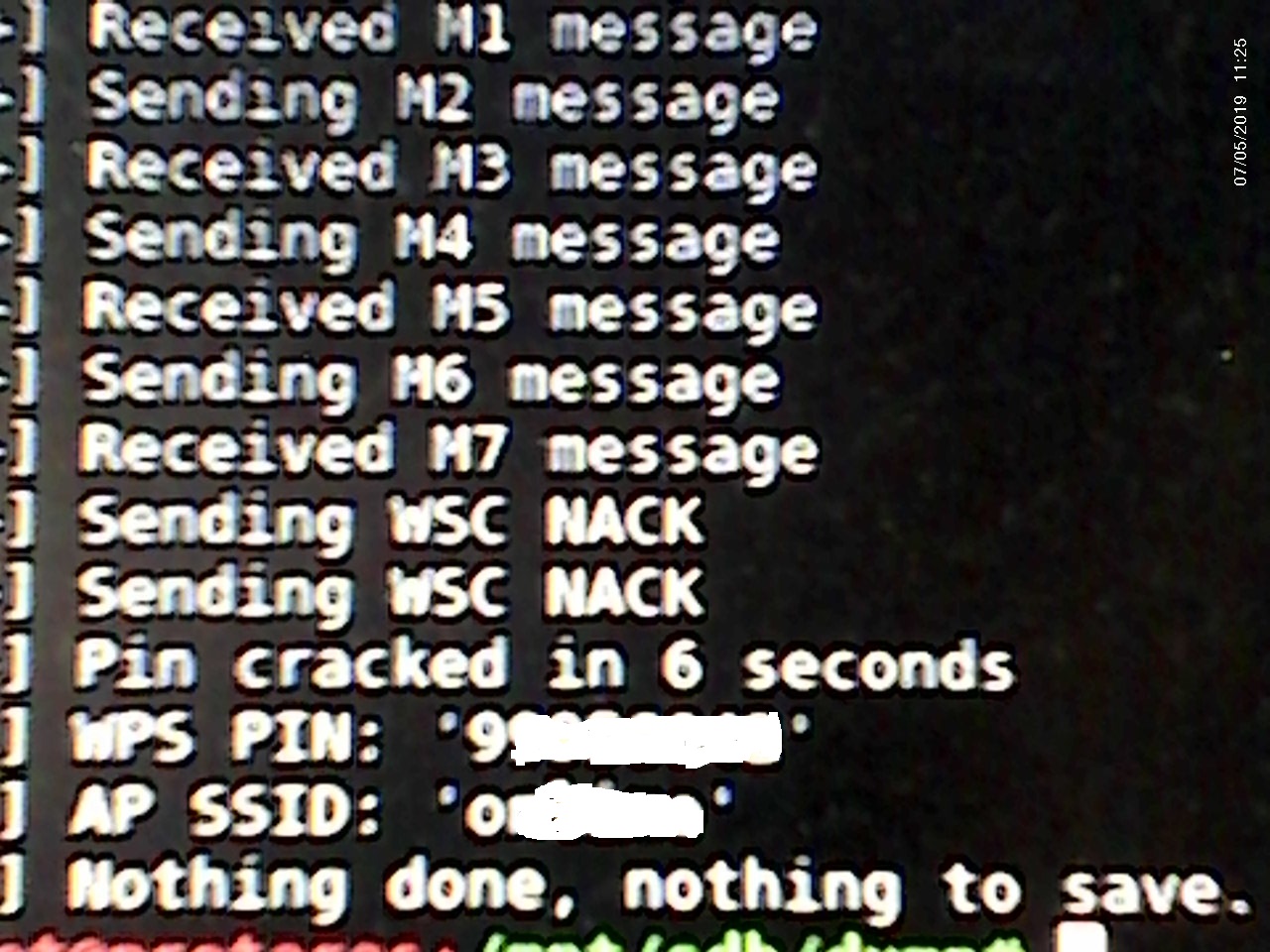 Использовал reaver -i wlan0mon -b BSSID -vv -s y -p xxxxxxxx и reaver -i wlan0mon -b BSSID -с XX -vv -s y -p xxxxxxxx И в обоих случаях получаю скрин с картинки. Чего reaver еще нужно чтобы вытянуть пароль?