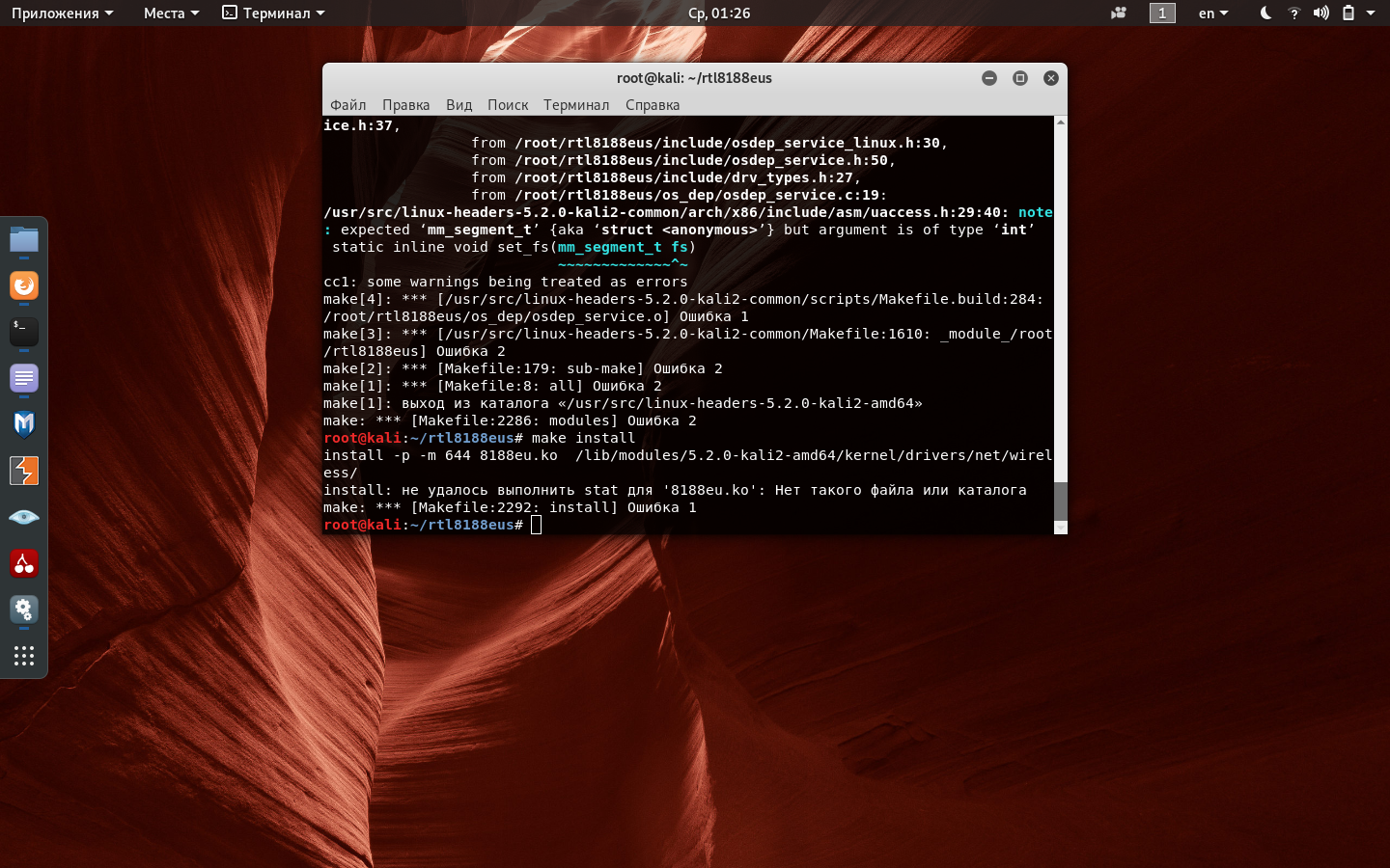 Купил я как то давно этот прекрасный свисток и недавно решив снова попробовать "повардрайвть" столкнулся с проблемой что дрова которые подкачивает kali linux не позволяют перевести сие чудо в режим мониторинга. потратив несколько часов выяснилось что эта проблемы присутствует у адаптеров 2-ой и 3-ей версии. Покопавшись в интернете ещё какое-то воемя я нашёл некоторые варианты решений на все они не помогли. последнее что я посмотрел это видео какого-то человека на youtube() где он показывал процесс установки кастомных дров для решения проблемы. Попробовав его способ я столкнулся с некоторыми ошибками на моменте установки(make, make install). Погрешив на старую версию kali я переустановил дистрибутив сменив его более новой версией iso-образа, ошибок стало меньше, но всё равно kali не пускает меня дальше make. Ниже приложу скрины терминала со всеми вытекающими. Буду признателен любому совету.