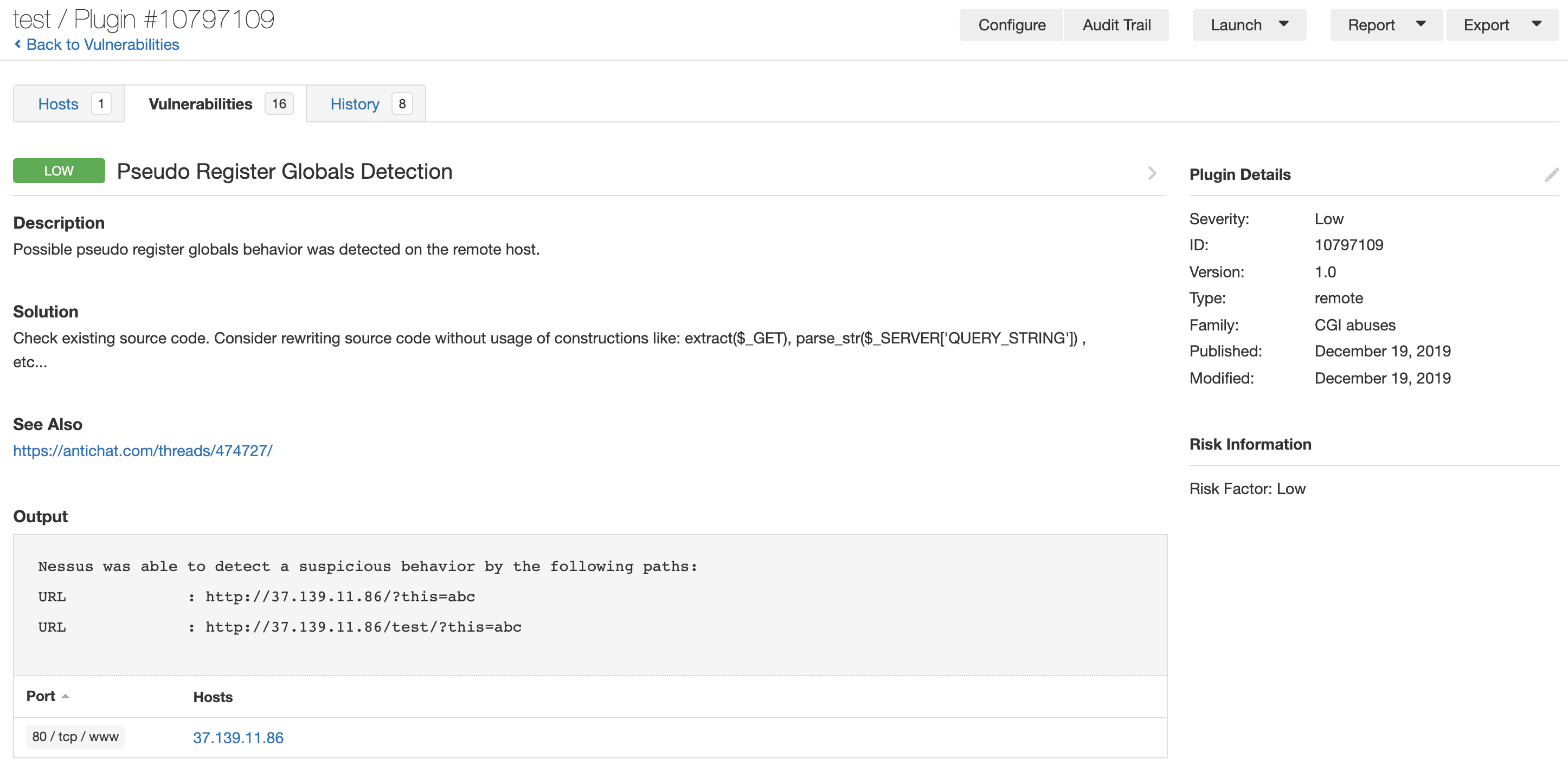 Для тех, кто любит автоматизацию, плагин для Nessus, который определяет наличие такой ситуации по наличию в заголовках или теле ответа характерного текста