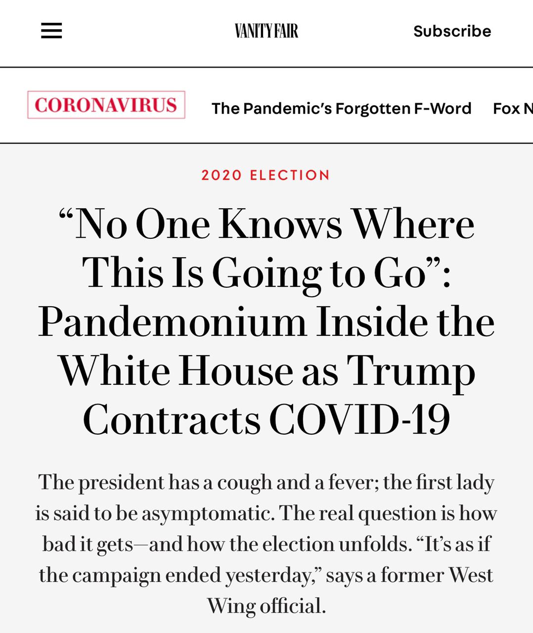 «Никто не знает, чем это кончится. У Трампа ухудшилось состояние, у него появились кашель и температура. Переживают из-за его возраста»: Vanity Fair сообщает инсайд из Белого дома, со ссылкой на двух неназванных республиканцев, «которые находятся в тесном контакте с Белым домом».