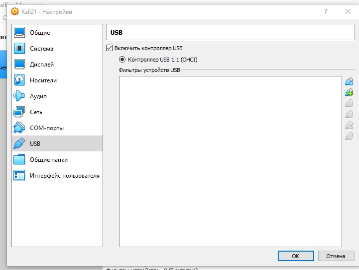 На вкладке юсб вот что(см.скрин) Нажал File->Reset all warnings , да это сообщение появляется при шелкании мышью в окне вирт.машины, но проблему не решает ( Пробовал ставить в разные разъемы, он у меня не в юсб 3 , не помогает. Другого интерфейса при установке Кали у меня нет. Скачивал с офф. сайта кали 2021.1