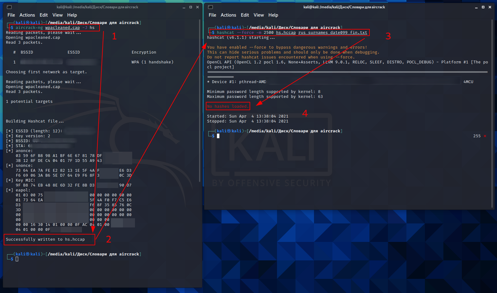 Всем привет. Нужен ваш совет. Я тут новенький, если что не так, сильно не бейте. Короче я захватил handshake через Airodump-ng, проверил его через cowpatty, потом обработал его через wpaclean. Всё без ошибок разумеется. Получившийся очищенный и подготовленный хендшейк я конвертировал через aircrack-ng с атрибуто "J", т.е. подготовил его для hashcat, но утилита ругается: No hashes loaded. Запускаю так: hashcat --force -m 2500 hs.hccap rus_surnames_date099_fin.txt Пробовал прописать абсолютные пути к файлам - то же самое. Не понимаю что за проблемы с хешем???? Подскажите что не так?