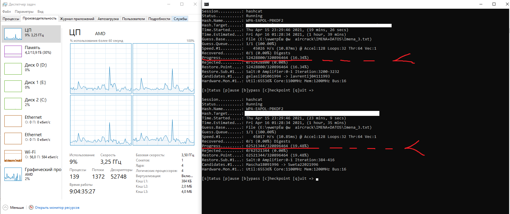 hashcat.exe -m 2500 -a 0 -w4 --force -D 1,2 (дальше своё для перебора ставь) Увидишь загрузку проца и видеокарты. Тормоза ещё возможно будут. Тогда параметр -w4 поменяй на -w3 или меньше.