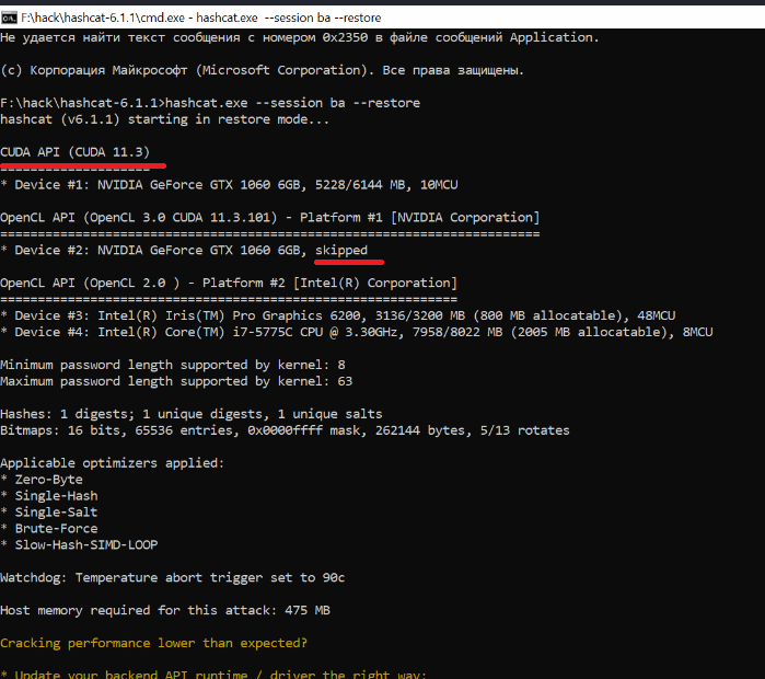 Привет народ. Сегодня установил cuda_11.3.0 . У меня появилось ещё одно устройство в hashcat но теперь пишет устройство 2 пропущено Так должно быть?