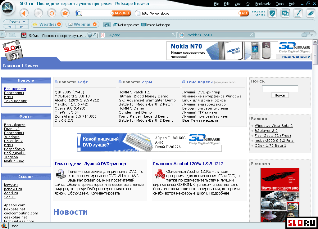 На FTP компании Netscape появилась новая версия одноименного браузера. Об изменениях в этой версии на данный момент неизвестно. Реинкарнация некогда популярного (до пришествия IE — был стандартом), а ныне окончательно сдавшего позиции www-браузера. Новая попытка Netscape Communications отхватить кусочек бурного рынка средств для просмотра WWW. За основу взяты сразу два браузера — Mozilla Firefox и Internet Explorer — изюминка в виде любопытной возможности переключения между движками, с целью 100% корректного отображения содержания просматриваемых страниц. В общем, и целом вполне жизнеспособный продукт, имеющий право на пользователей. Cкачать Скнин1 Скрин2 источник: _http://www.it-top.ru/news38691.html