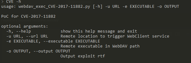 doc не получиться создать - експлоит только для rtf. И то не для модификации существующего, а создания нового(-о /куда/сохранить/новый.rtf). -u и -e имеют дело с WebDAV сервером и нужны для скачивания екзешника. Я с ними даже не разбирался т.к. не имею WebDAV сервера. Кастомную комманду можно исполнить подредактировав скрипт exploit'а